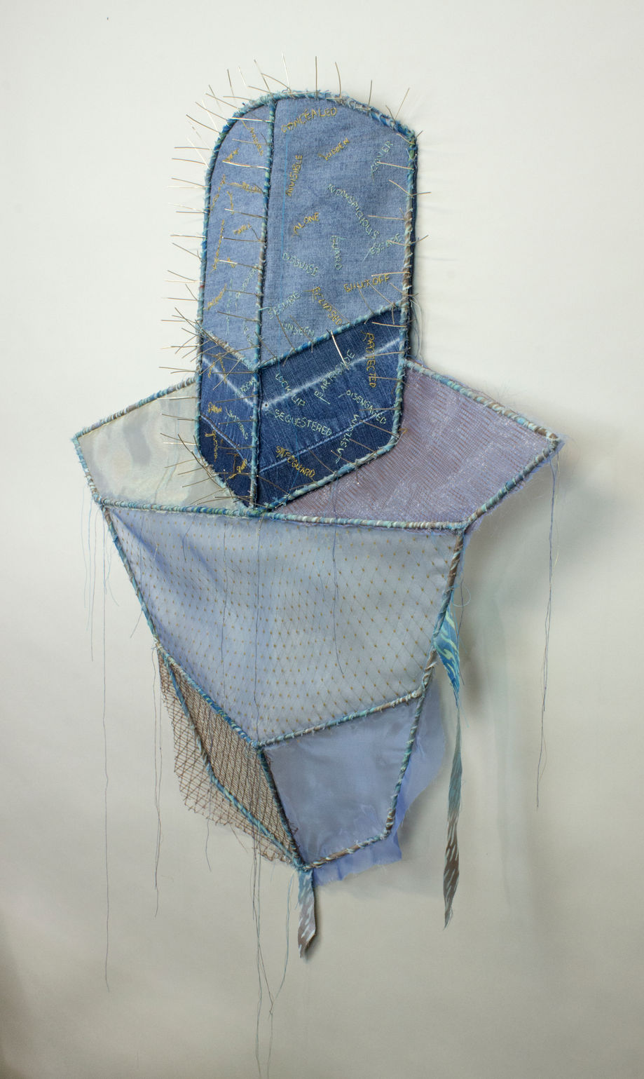 The works in Shielded State were originally inspired by images of protective gear worn by medical personnel, law enforcement, protesters, and others since the pandemic hit in 2020. As the series evolved, the narrative encompassed both past and current societal practices of exclusion and division. The wall relief format emphasizes the shield-like nature of the barriers and façades we invent. The forms allude to the multiplicity of ways we create or experience separation from one another literally and/or symbolically. Metal protrusions, hanging threads and fabric strips insinuate transition, time, and the pain of exclusion. Opaque heads with stitched words are physically emphatic, but transparent, diaphanous bodies reveal the flimsiness of our flawed labels and ideas.